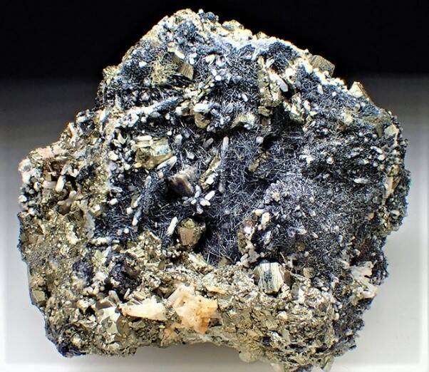 Afb. 26: Grijsblauwe vezels boulangeriet (Pb5Sb4S11) met pyriet op matrix, afkomstig uit Kosovo.