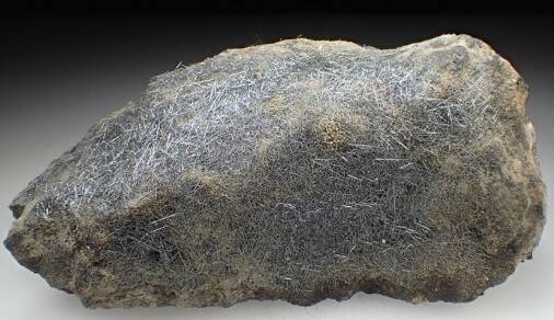 Afb. 27: Grijze vezels jamesoniet (Pb4FeSb4S14) op matrix uit Mexico.