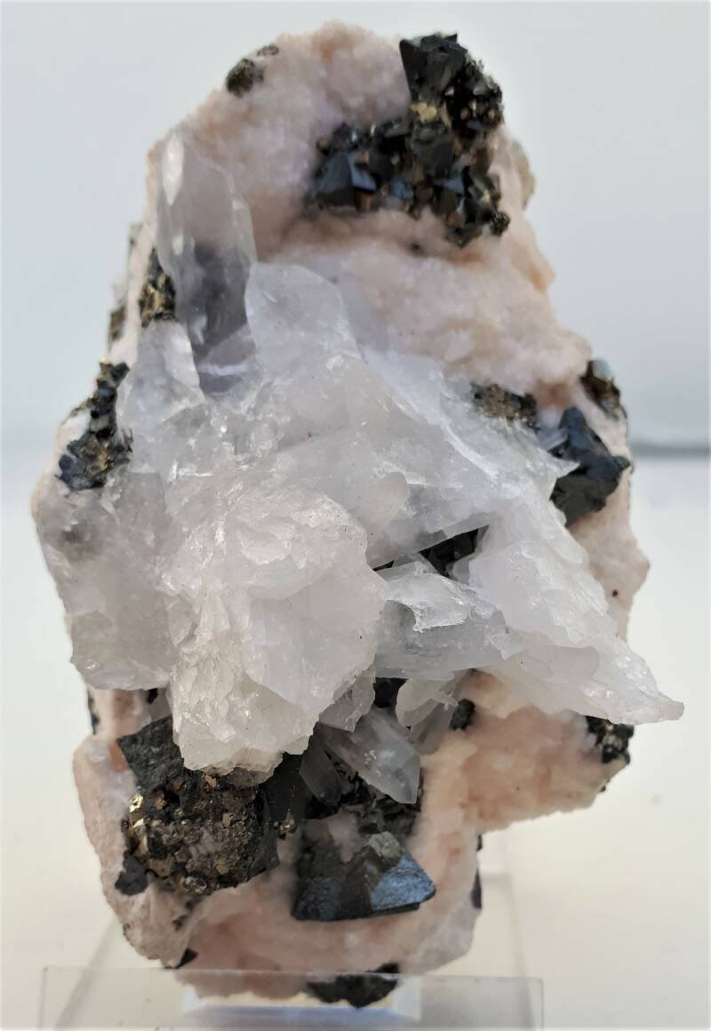 Afb. 15: Blinkend arsenopyriet met bergkristal en oranjebruine rhodochrosiet uit Kosovo.