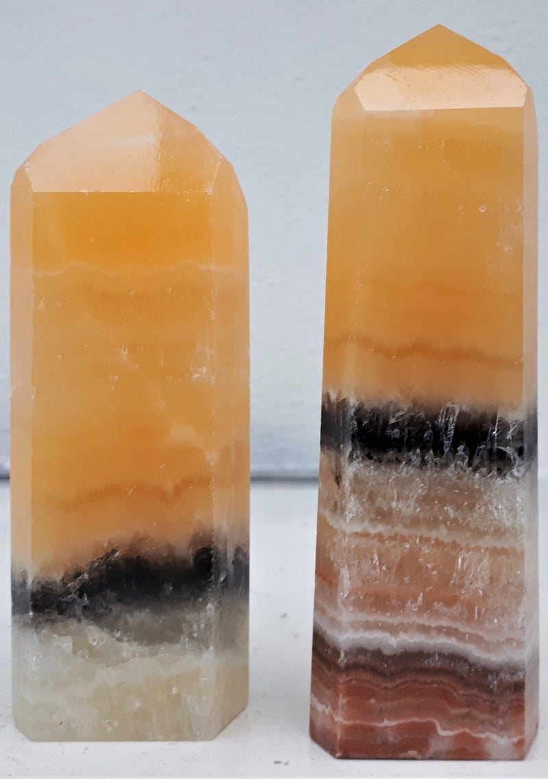 Afb. 10 (rechts): 2 obelisken van calciet met mooie kleuren.