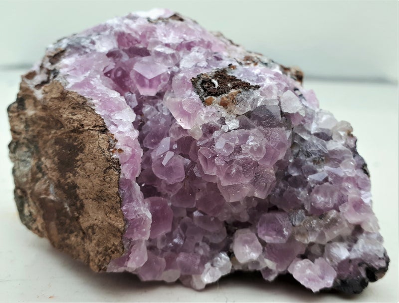 Calciet is van zichzelf kleurloos, maar komt door ‘verontreinigingen’ voor in veel kleuren. En ook in veel vormen. In 1.06 zag je al een foto van bruine ‘dogtooth’ calciet, zo genoemd omdat de kristallen op hondentanden lijken. In het vervolg een aantal foto’s van verschillende calciet-exemplaren in ons bezit.