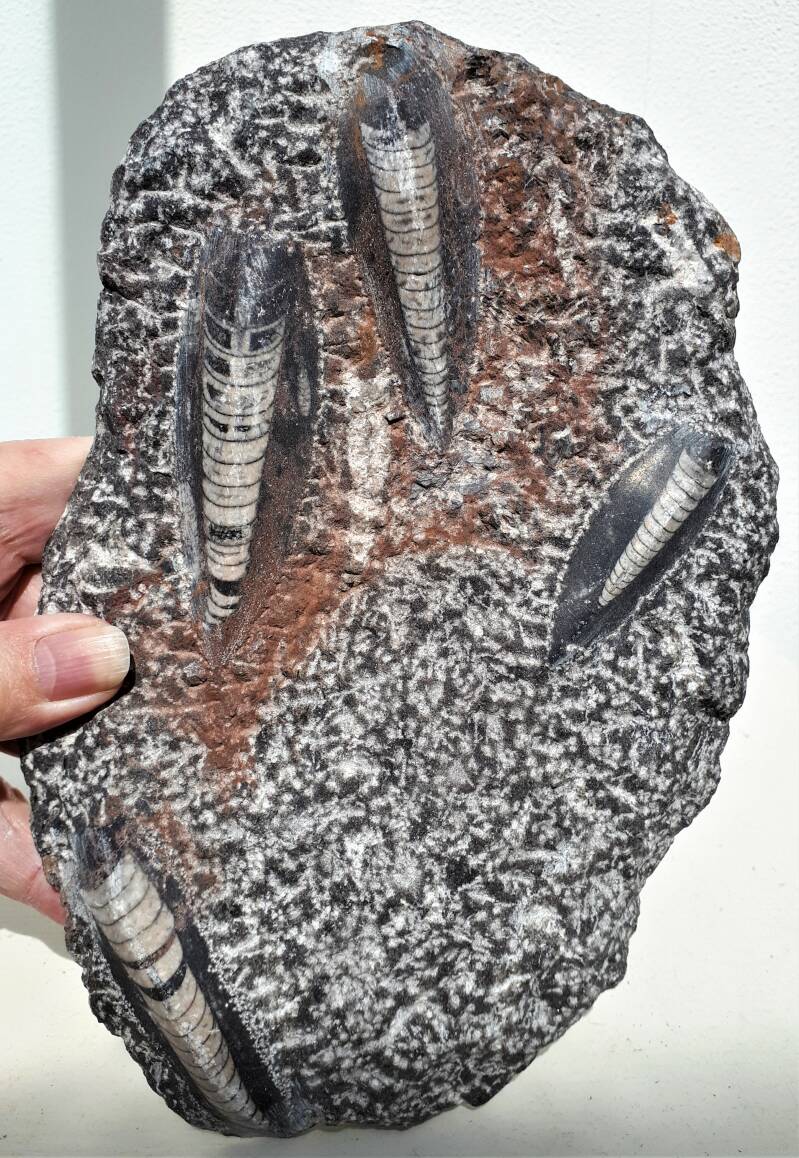 Afb. 16: Deze orthoceras-fossielen uit Marokko liggen bovenop een stuk rots.
