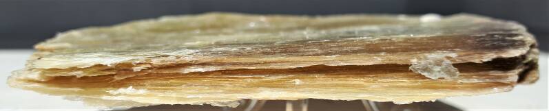 Afb. 1: In 1.03 staat een stukje muscoviet, een mica-soort, afgebeeld. Hierboven een foto van de zijkant van datzelfde stukje, waarbij je goed kunt zien dat het mineraal is opgebouwd uit laagjes.