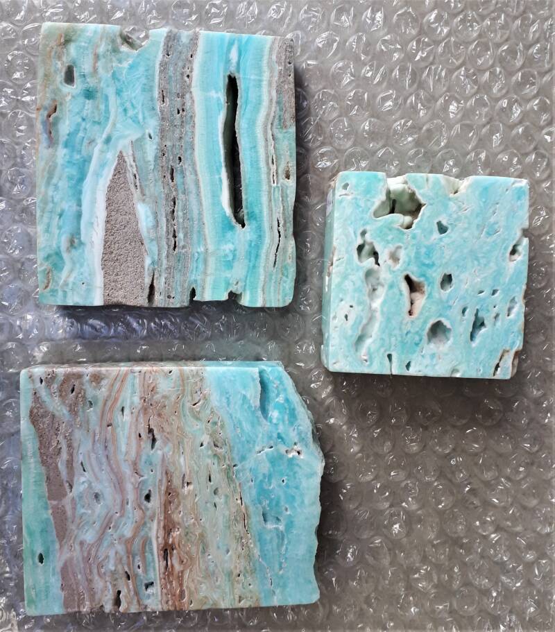 Afb. 29 (links): Drie plakjes Zeiringiet (wordt ook wel verkocht als 'Caribbean aragoniet' of 'Caribbean calciet').