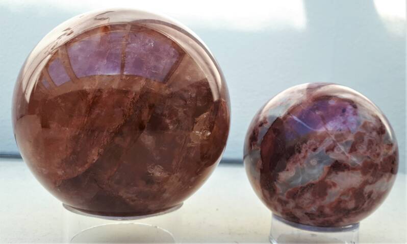 Afb. 21: Een bol en een free form van calciet. De verkoper noemt het honing-calciet, maar daarvoor vind ik het wat te rood. Vergelijk de kleur maar eens met de honing-calcieten in 2.14.