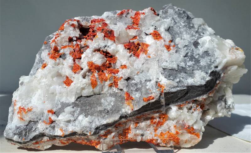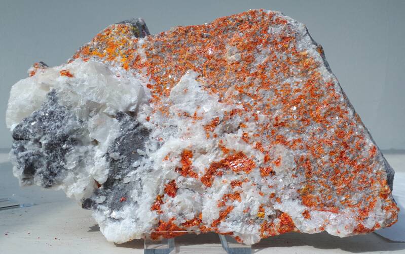 Afb. 4a (boven) en 4b (onder): De verkoper wist eigenlijk niet goed wat dit is. Het witte mineraal kon apofylliet zijn, maar ook adamiet. En het oranje was waarschijnlijk vanadiniet. Maar zou wat mij betreft (door het ontbreken van de voor vanadiniet kenmerkende honingraatjes) ook best realgaar kunnen zijn (zie ook 2.10 Arseen plus, afb. 1).