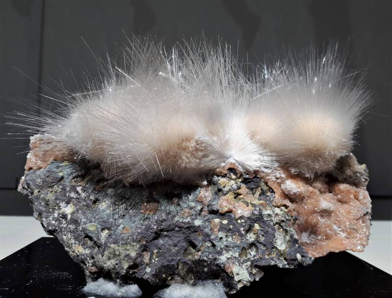 Afb. 10: Ondanks dat dit maar een klein steentje is, is het wel een schatje. Bolletjes oranje thomsoniet zijn bedekt met ragfijne naaldjes mesoliet of okeniet. Afkomstig uit India.