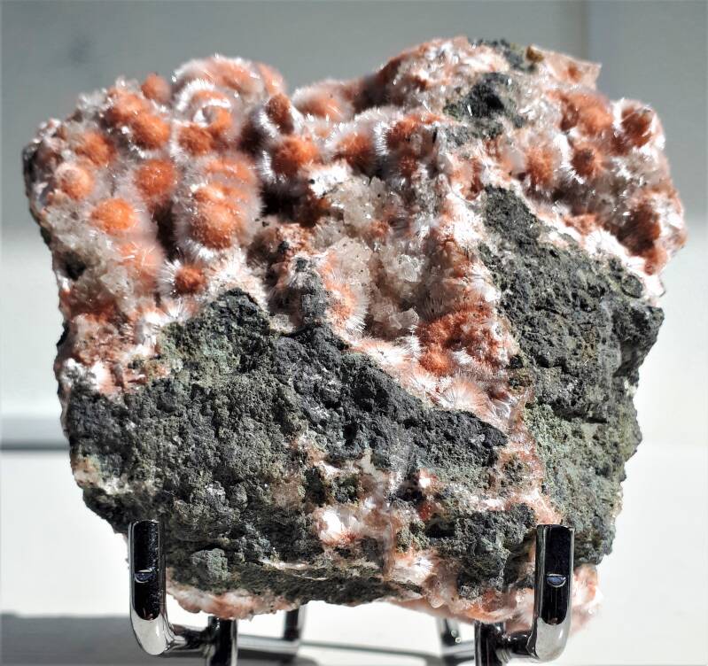 Afb. 4: Oranje bolletjes thomsoniet met hele fijne naaldjes mesoliet op matrix uit India.