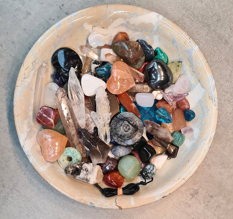 Als je wat langer verzamelt zit je na verloop van tijd met een hele berg kleinere stenen. Soms koop je eens een leuke 'handsteen', vaak zijn ook cadeautjes bij bestellingen. En wat doe je daar dan mee? Je kunt ze tussen grotere stenen leggen of naast elkaar op een richel. Maar meestal leg je ze in een schaal want dat geeft een leuk decoratief effect.