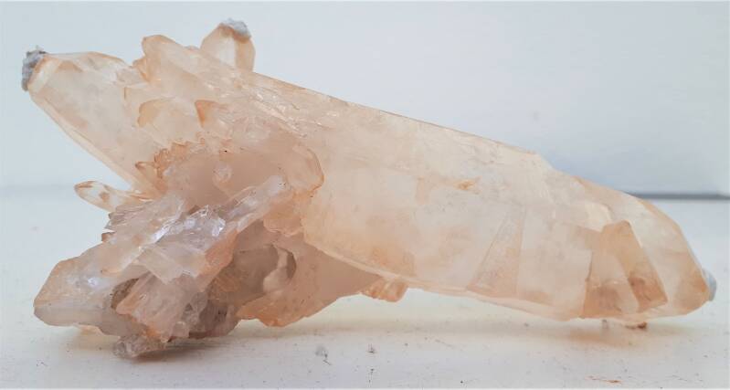 Afb. 5: Een punt van bergkristal met wat ijzerkwarts. Aan de voet zit een cluster kleinere kristallen.