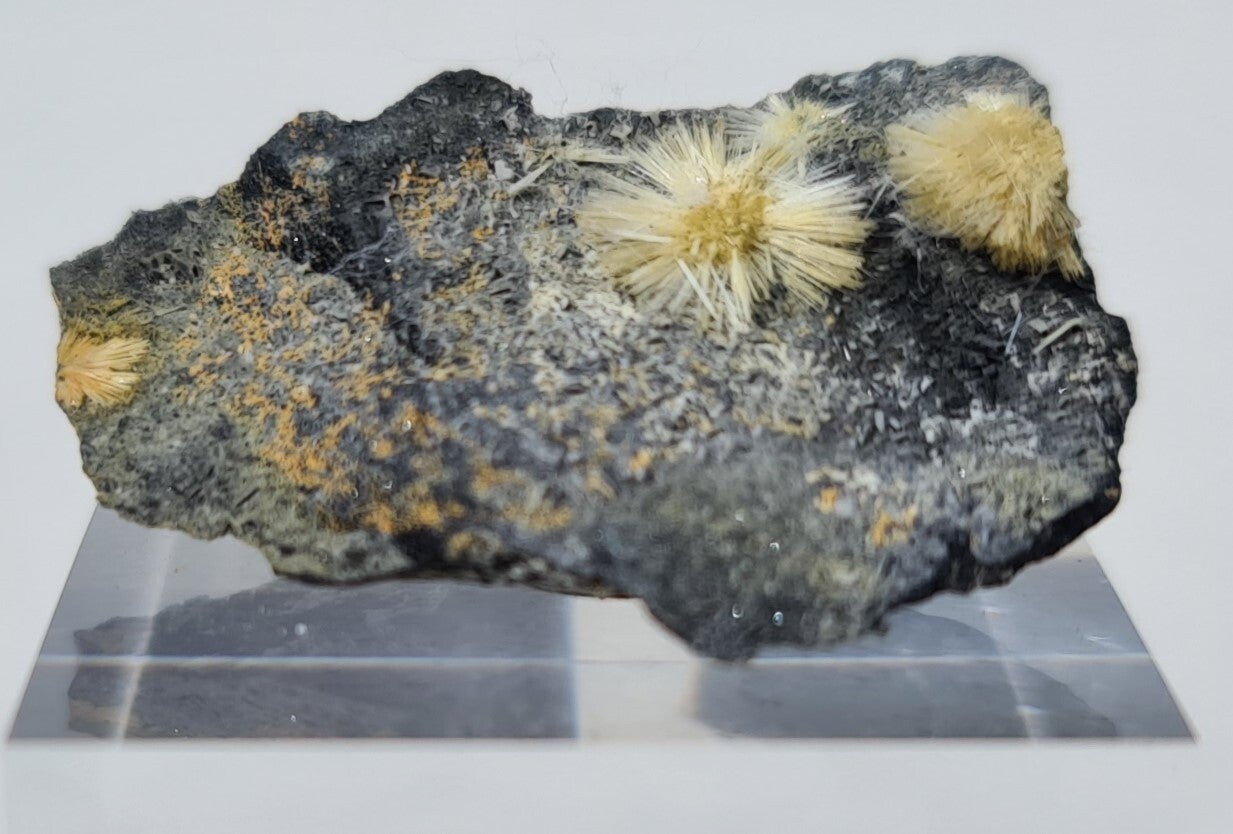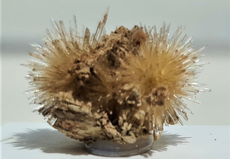 Afb, 5: Deze gele valentiniet (Sb2O3, antimoonoxide) op matrix heeft de vorm van een anemoon. Het steentje is gemonteerd op een fraai perspex sokkel. Afkomstig uit China.