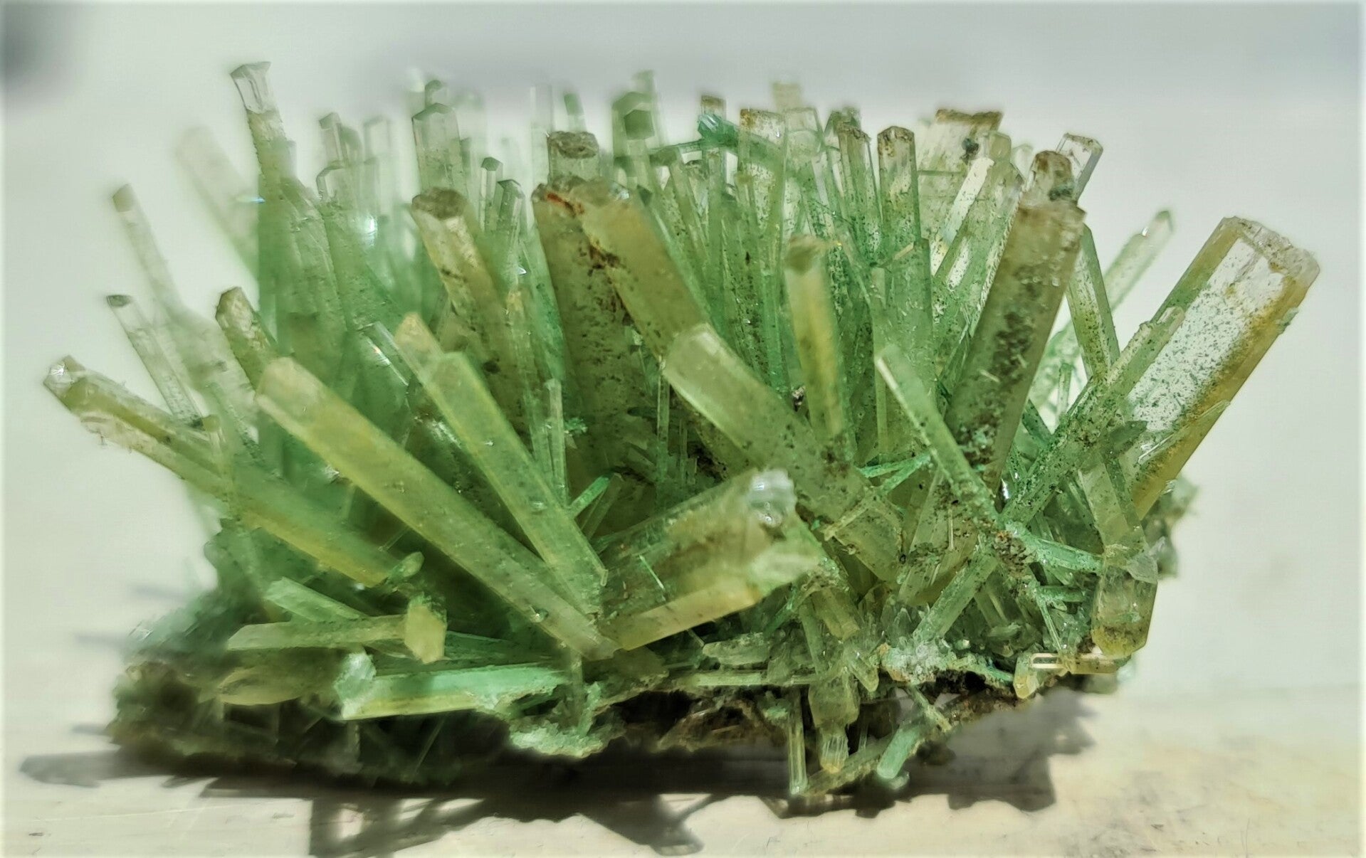 Afb. 10: Een cluster groene en blauwe vivianiet-kristallen, afkomstig uit Brazilië. In de praktijk bestaat dit dus uit een mengsel van ijzer(II)- en ijzer(III)-ionen.