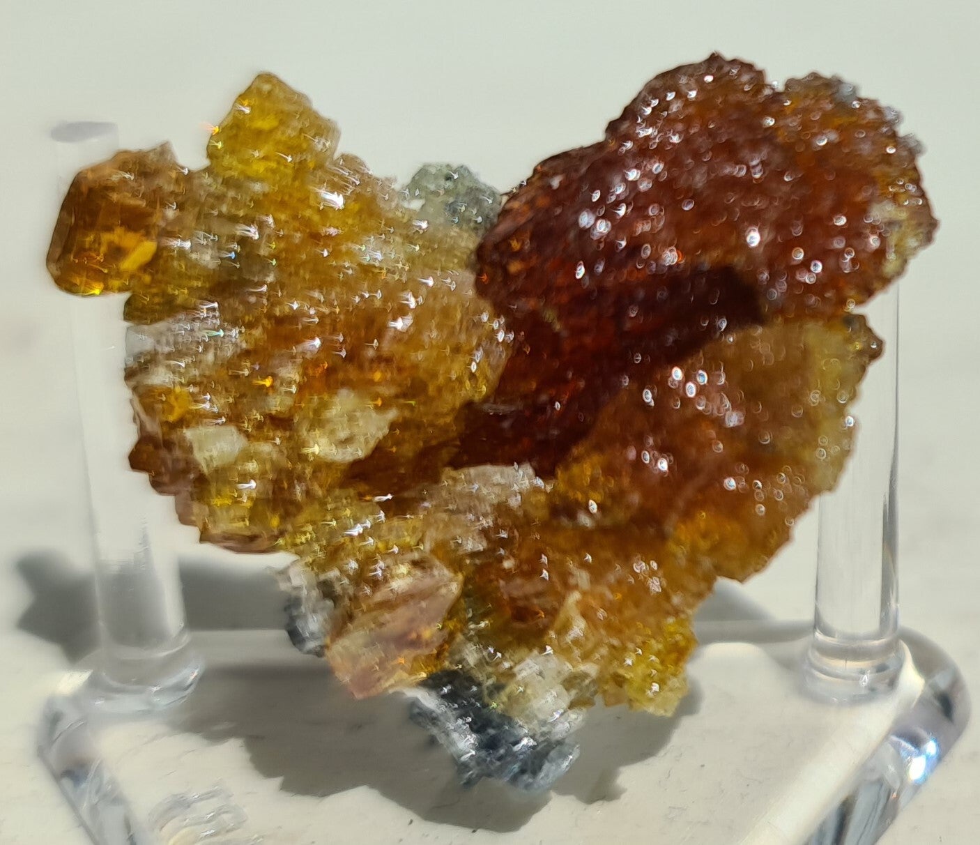 Afb. 20: Een fraai stukje zinkiet, (ZnO, zinkoxide), ook al afkomstig uit Polen. De oranjebruine kleur wordt veroorzaakt door mangaan. (Zn,Mn)O is daarom wellicht een betere formule. Zoals eerder aangegeven een van mijn favorieten. Helaas is dit geen natuurlijk stuk, maar volgens de verkoper ontstaan in de schoorsteen van een smelterij. Ook wordt er tegenwoordig zinkiet in het lab gemaakt. Natuurlijke zinkiet wordt eigenlijk alleen in de VS gevonden.