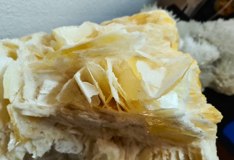 Links een foto van een enorme (c.a. 20 kg) 'engelenvleugel' calciet. Bijzonder zijn de vele lamellen, waarvan hieronder een detailopname.