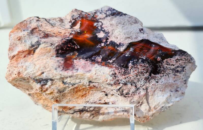 Het stuk rechts is echt one-of-a-kind. Lepidoliet loopt als een aantal rode stralen door de matrix. Die bestaat voor een groot deel uit kwarts en/of calciet. Maar er zitten ook heldere lichtblauwe stukken bij en dat zou kunnen wijzen op de aanwezigheid van aquamarijn.