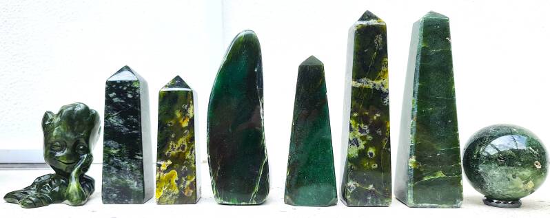 Afb. 5: Diverse vormen van jade. Geheel links het hoofd van een of ander, mij onbekend, stripfiguur.