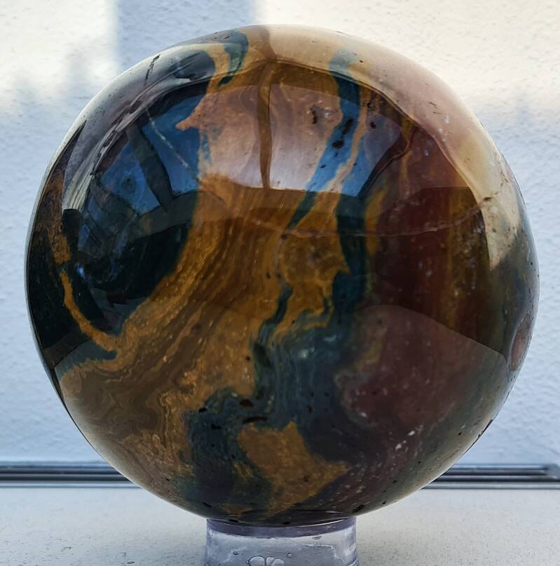 Afb. 18 (rechts): Een veelkleurige (blauw, groen, geel goud, rood) bol van agaat en jaspis met een gewicht van 4,3 kg. Herkomst: Madagaskar.